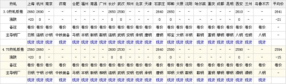 | 3.0熱軋板卷 | 2660 | 2690 | - | - | - | - | - | - | 2650 | 2590 | - | - | - | 2640 | 2650 | - | - | - | - | - | - | 2610 | - | - | 2641 |